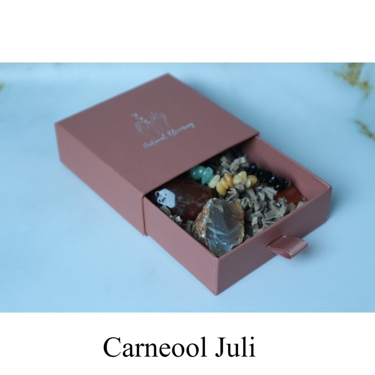 Elk setje bevat een splitarmbandje, een ruwe steen , een getrommelde steen en een hanger.
