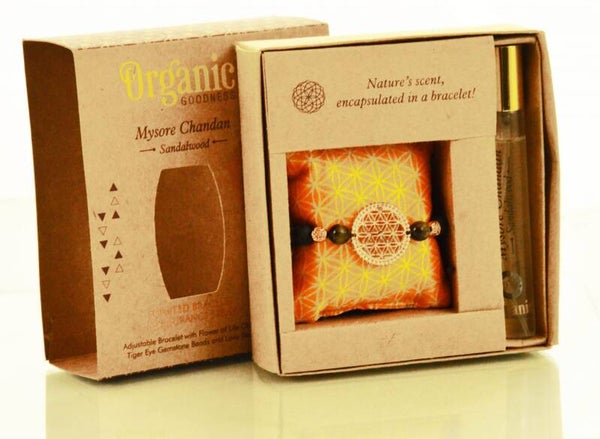 Dit elegante cadeauset bestaat uit een verstelbare armband met bloem des levens bedel, tijgeroog kralen en lavasteenbolletjes die de geur vasthouden, een kussentje en spray met biologische etherische olie.