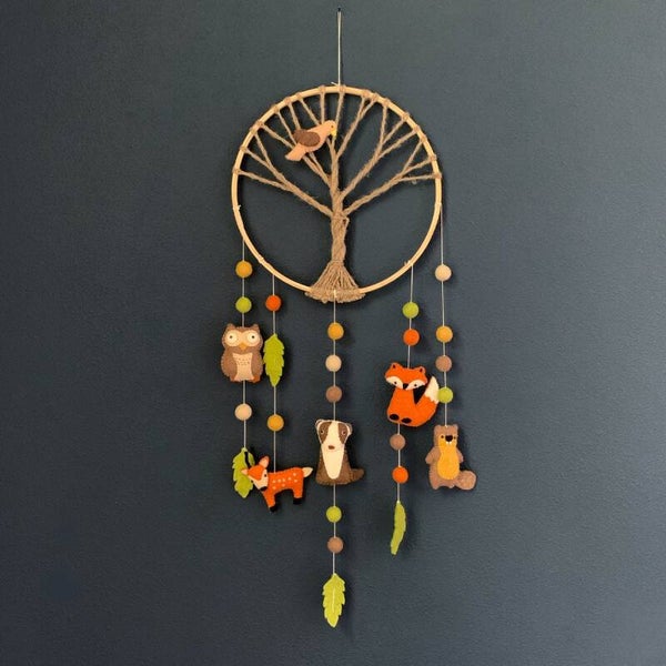 Een bijzonder item voor de baby of kinderkamer is deze fairtrade gemaakte dromenvanger met bosdiertjes van vilt. Met uiltje, hertje, das, vos, bevertje en levensboom.